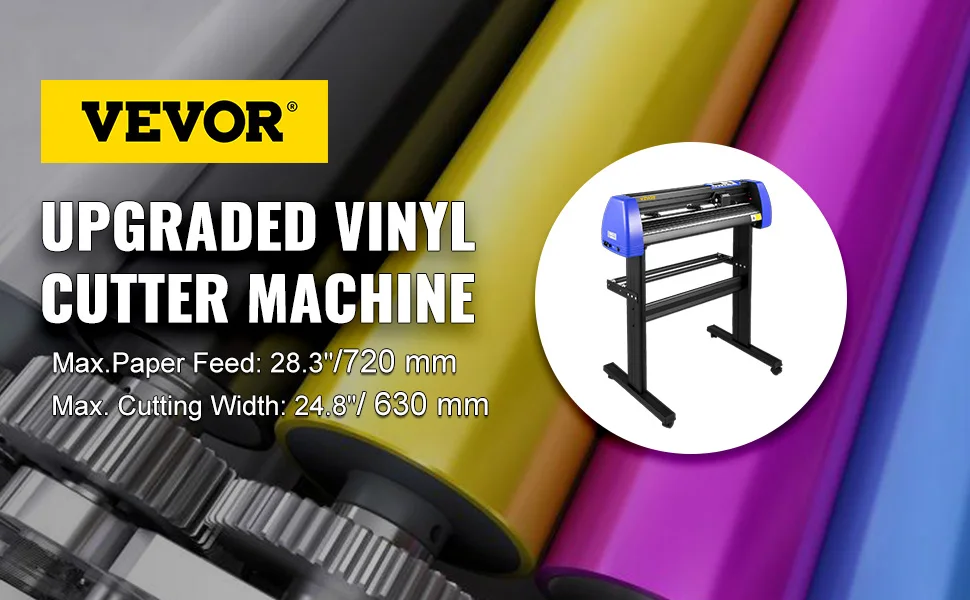 This 28" Professional Vinyl Cutting Plotter with stand comes with easy-to-use Design and SIGNMASTER software, which allows you to cut professional customized designs and signs, giving you the ability to use your fonts, import custom artwork, and draw your shapes! Our vinyl cutter has a robust construction with a durable stepper motor, which delivers high speed and low noise levels. Max Paper Feed: 28"/720mm; Max Cutting Width: 24.8"/630mm.