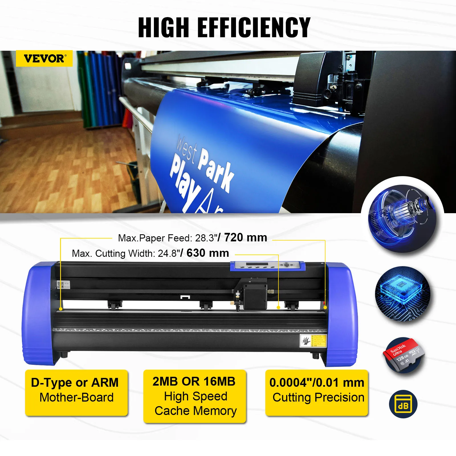With 28" / 720 mm large paper feed and 24.8" / 630 mm cutting width, this vinyl cutter features high cutting precision and paper feed precision, significantly improving work efficiency.