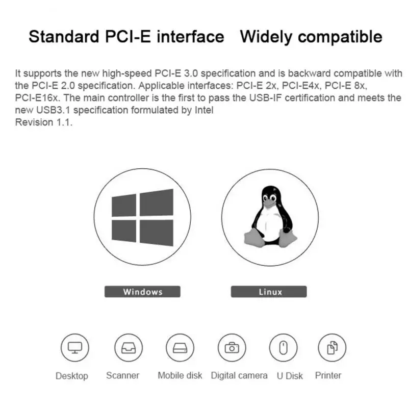It supports the new high-speed PCI-E 3.0 specification and is backward compatible with the PCI-E 2.0 specification. Applicable interfaces: PCI-E 2x, PCI-E 4x, PCI-E 8x, PCI-E16x. The main controller is the first to pass the USB-IF certification and meets the new USB3.1 specification formulated by Intel