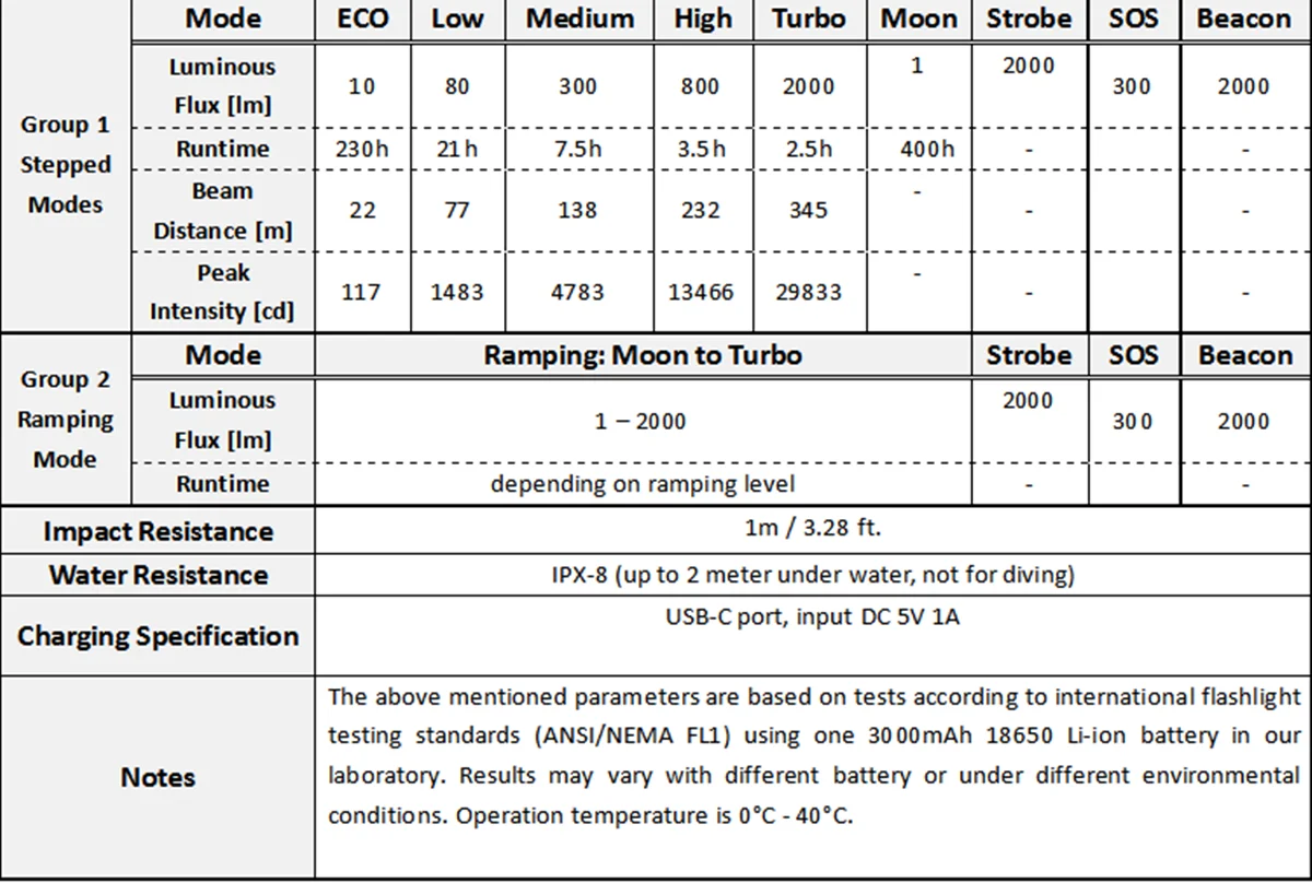 While on, press and hold to side switch to cycle through stepped modes: Eco-Low – Medium – High (Stepped mode group); or stepless ramping from 1LM to 2000LM (Ramping Group). 4 fast clicks to toggle between the two groups.