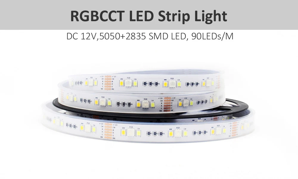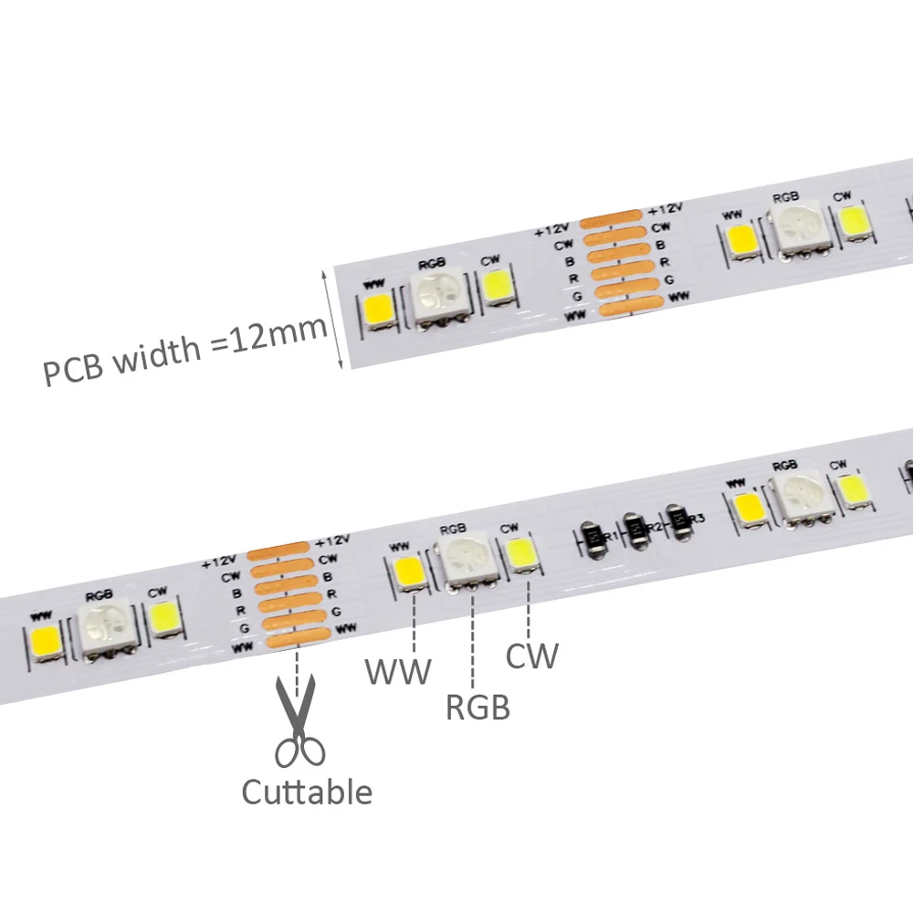 Количество: 90 светодиодов/м (30 шт. 5050 RGB + 30 шт. 2835 теплый белый + 30 шт. 2835 холодный белый)