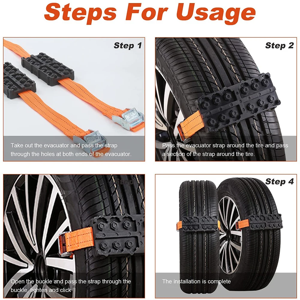 Установка в кратчайшие сроки: по сравнению с другими аварийными цепями для снега, эти ремни для шин для снега, тяговые ремни быстро крепятся на семейный автомобиль и стандартные шины для внедорожников или вездеходные двухколесные шины для дисков, просто пристегните их к верхней части ваших задних шин, затяните ремни, и вы хорошо идете.