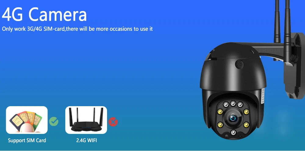 Your camera can work within the range of 3G/4G, it is easy to access the network environment.(not support WI-FI network)