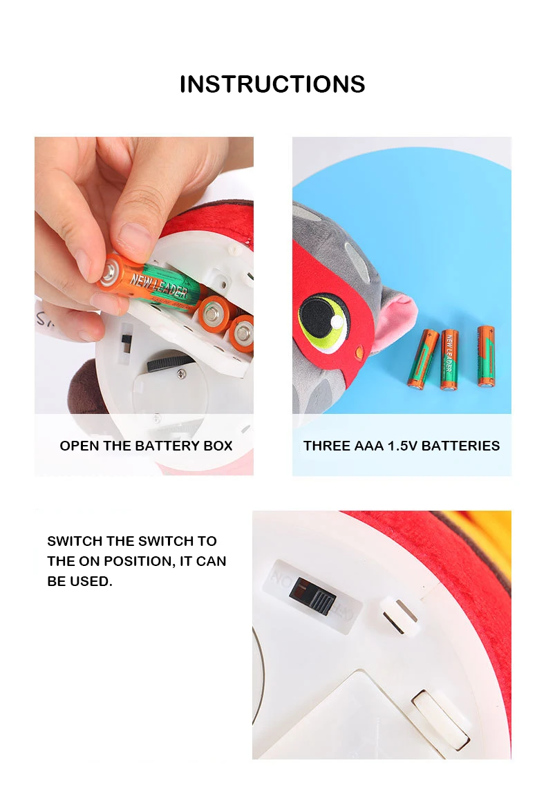 3. Положите игрушку кота Тома на плоский стол или землю, похлопывайте вибропереключатель головы, а затем том Кот начинает представиться (около 15 секунд). Представляя себя, он начинает петь, и Том кот будет двигаться вперед и назад и нерегулярно вращаться.