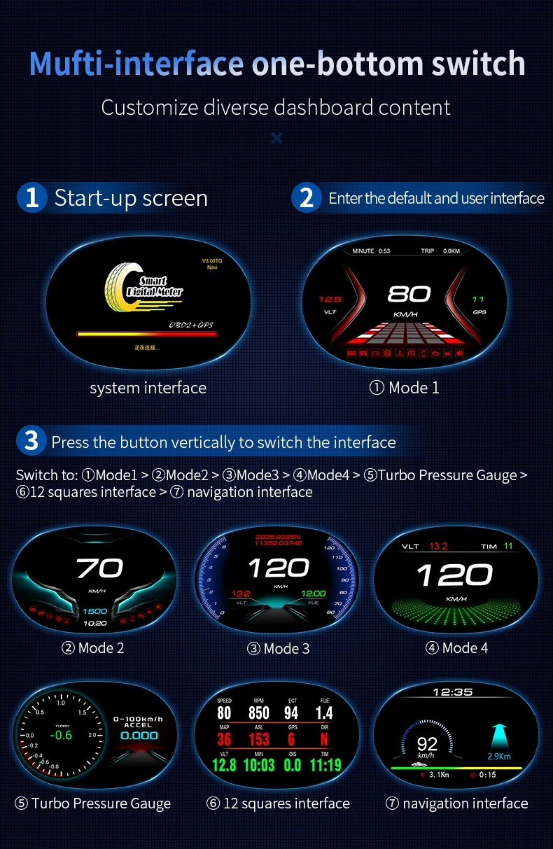 10. Информация о дисплее: скорость, двигатель об/мин, температура воды, расстояние вождения, напряжение батареи, давление турбины/давление впуска, неисправный код