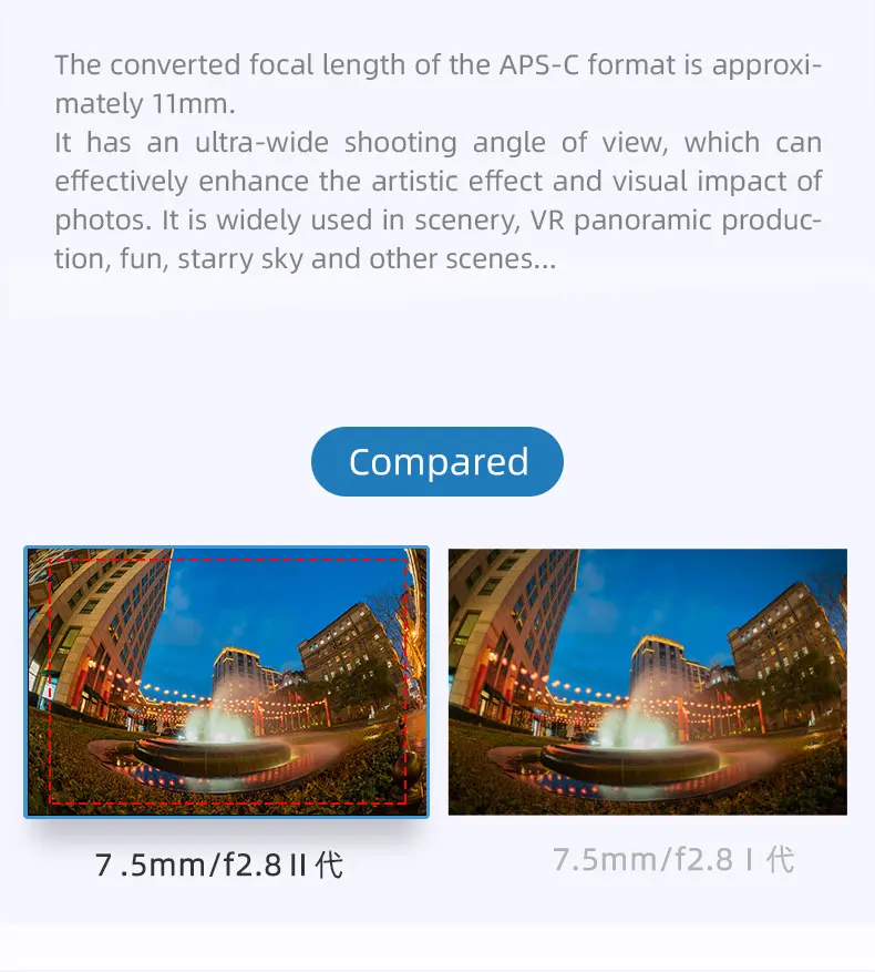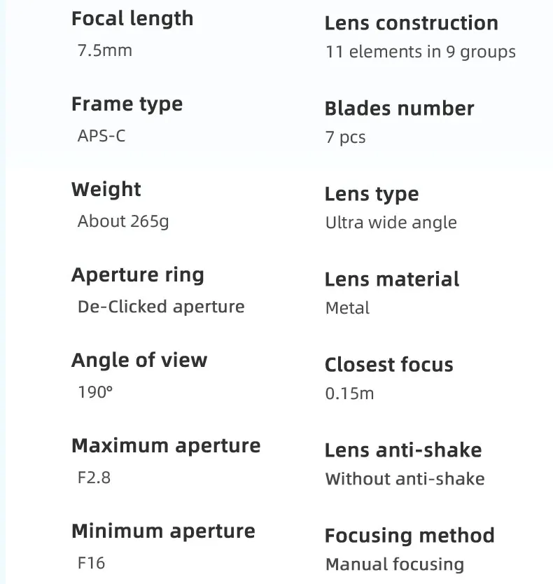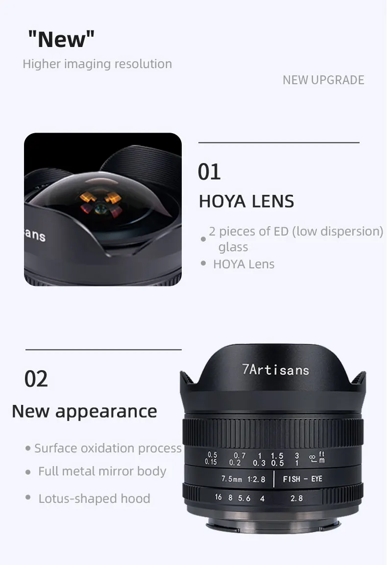 7 ремесленников 7,5 мм/f 2.8 Объектив рыбий глаз с максимальной диафрагмой F/2,8. Ближайший к нему и расстояние фокусировки составляет 0,15 м; 190 ° большой угол обзора.