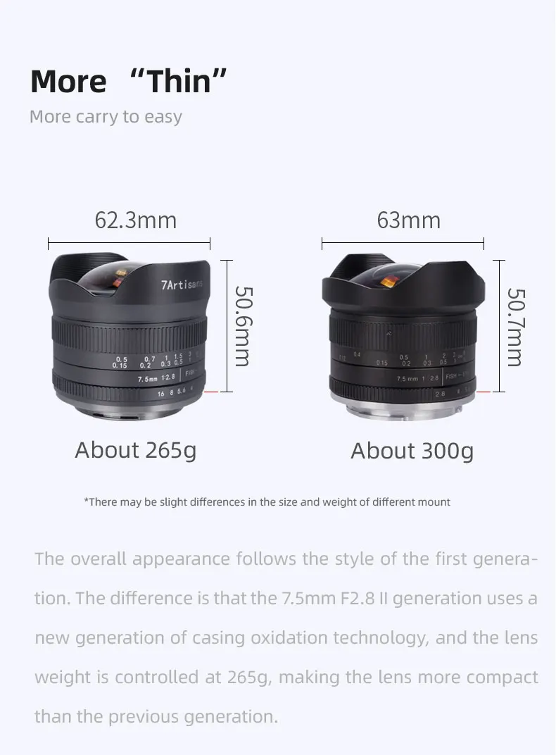 7 ремесленников 7,5 мм/f2.8 весами светильник как 265g, которая портативна для вашей фотографии. Также имеется Складная вытяжка, которая удобна для съемки на открытом воздухе. Вы можете использовать его на панораме, макросъемке, широкоугольной фотографии и веселой фотографии и так далее.