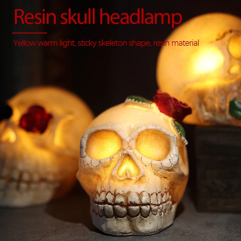Желтый теплый светильник, форма черепа, материал смолы.