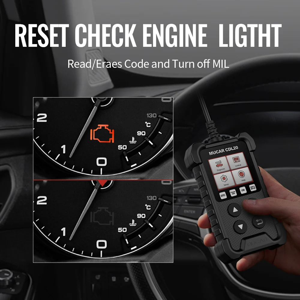 Mucar CDL20 позволяет легко очистить сигнальный светильник двигателя после завершения полной диагностики obd2. Основной целью этого инструмента является: