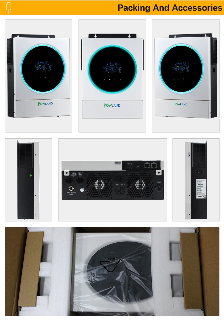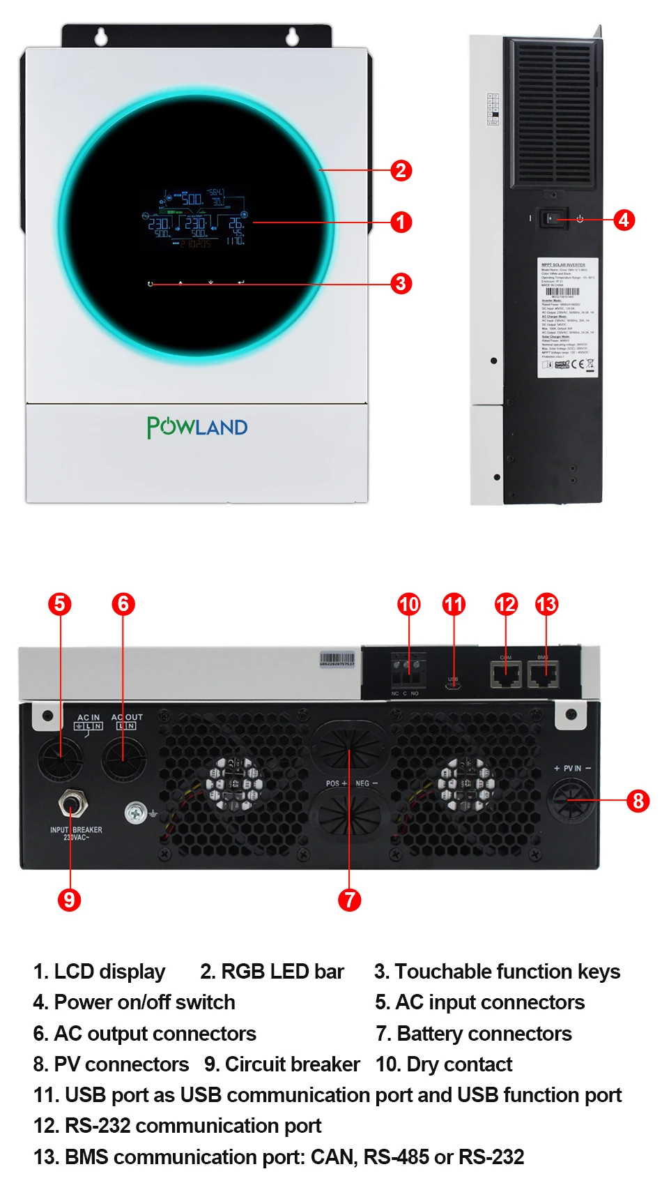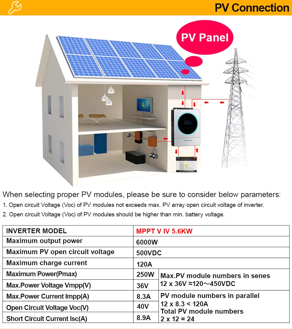 5.6KW солнечный инвертор MPPT 5600W 230V 48v высокий PV вход 500vdc 120A MPPT зарядное устройство 100A зарядное устройство встроенный Wifi Примечание:Это местный магазин POWLAND в Италии.Вам не нужно платить дополнительный налог на добавленную стоимость, Мы отправим вам товар со склада ЕС. Покупатели из ЕС, пожалуйста, будьте уверены в покупке! Особенности:· Настраиваемый статус светодиодный кольцо с RGB Подсветкой· Сенсорная кнопка с 4,3 "цветным ЖК-дисплеем· Встроенный Wifi для мобильного мониторинга (приложение доступно)· Поддержка функции USB On-the-Go· Журнал данных событий, хранящихся в инверторе· Резервный порт связи (RS485, CAN-BUS или RS232) для BMS· Независимый дизайн батареи· Выравнивание батареи продлевает жизненный цикл· Удобное управление ЖК-дисплеем· Увеличенная мощность зарядки· Встроенный комплект защиты от пыли