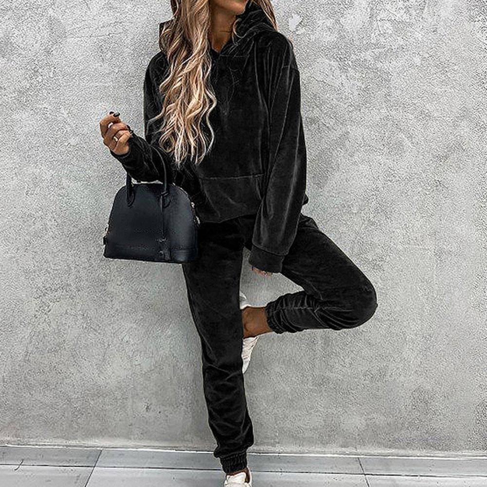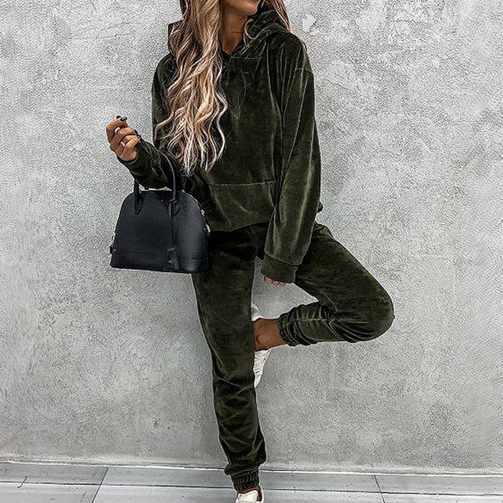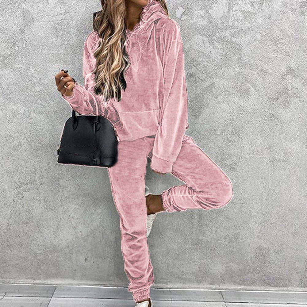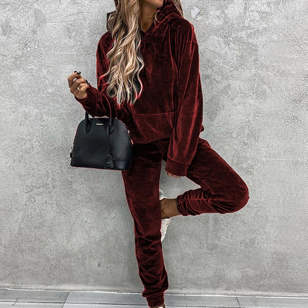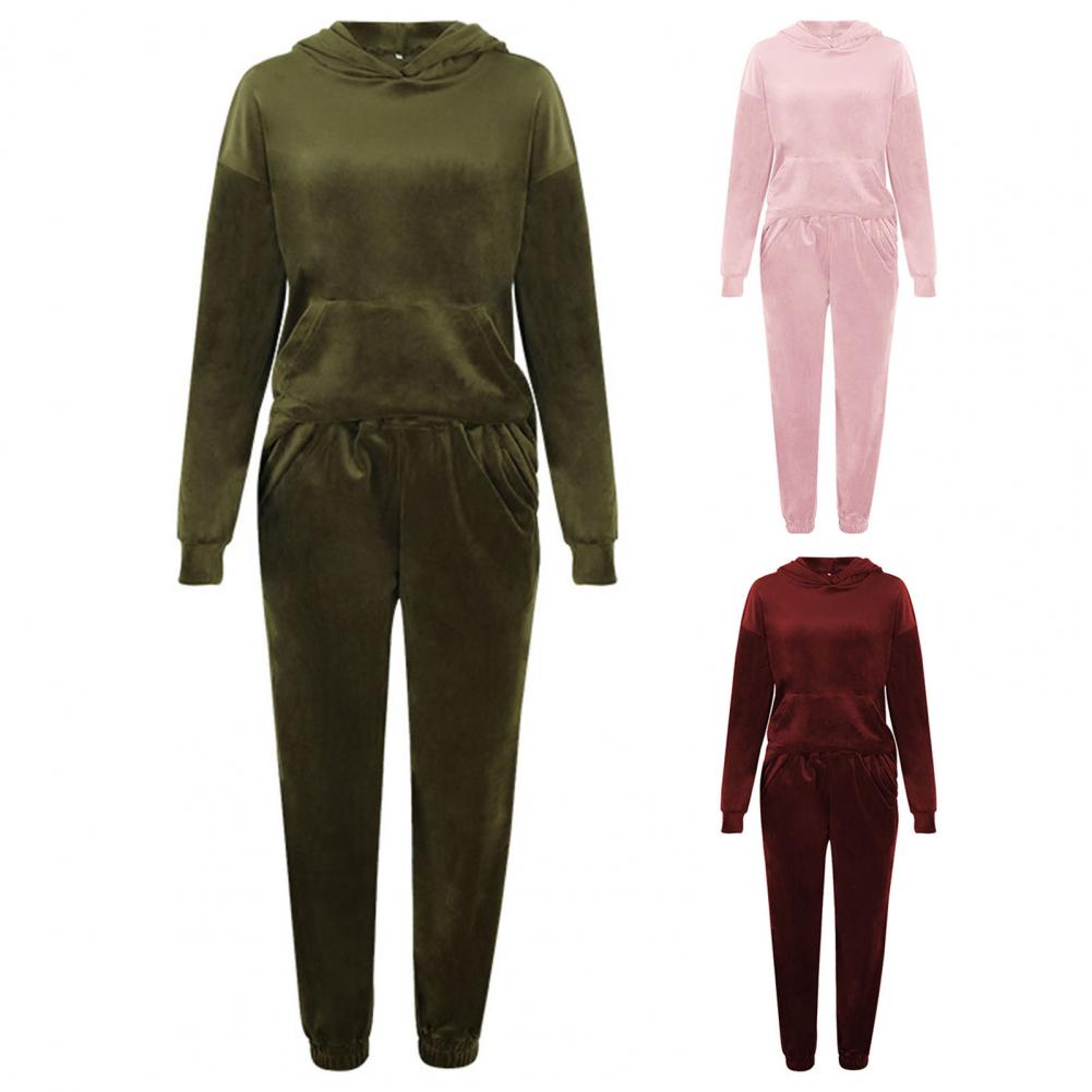 Спортивный костюм, однотонная бархатная блузка с карманами, женский спортивный костюм с длинным рукавом и капюшоном, спортивный костюм из двух предметов, комплект одежды для тренировок