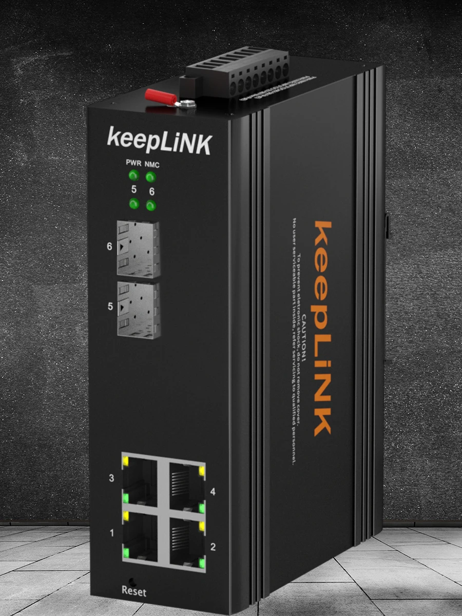 KeepLink повышенной прочности KP-9000-75-2GX4GP-V промышленный управляемый PoE + переключатель, с отделкой в стиле колор блок 4 10/100/1000 Мбит/с BASE-T 802.3af/at PoE + Port s с каждым портом мощностью до 30 Вт и 2 1000 Мбит/с оптоволоконным портом s в прочном, но компактном корпусе IP40, может быть установлен в любой сложной среде без ограничения пространства. Он обеспечивает прочную производительность в суровых условиях, например, в наружных IoT и промышленных приложениях.