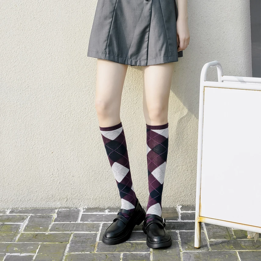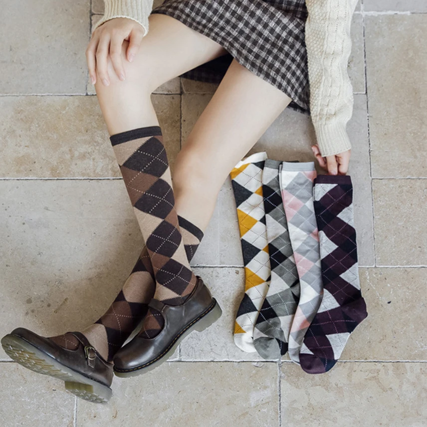Харадзюку, женские гетры, винтажные, до середины икры, хлопковые носки, гольфы, готические, ромбовидные, теплые, для девочек, школьные, Лолита, длинные носки