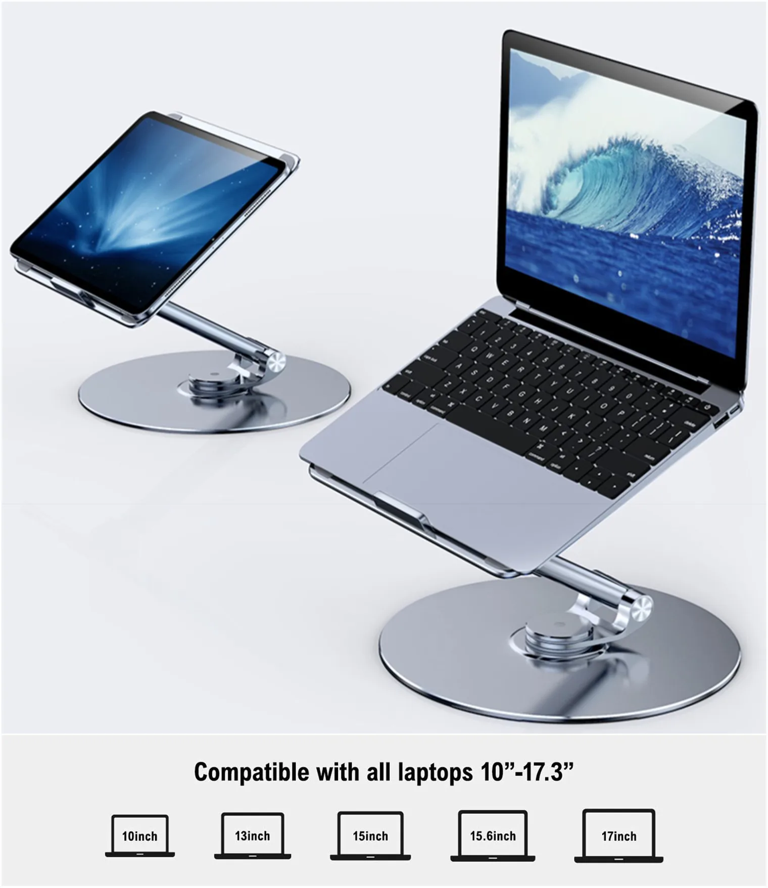 Широкая совместимость: Этот вращающийся стояк для ноутбука для стола хорошо совместим со всеми ноутбуками от 11 до 17 дюймов, такими как MacBook 12 дюймов/13 дюймов, MacBook Air 13 дюймов, macBook Pro 13 дюймов/15 дюймов/17 дюймов, Microsoft Surface, Dell, HP, Chromebook и другие устройства.