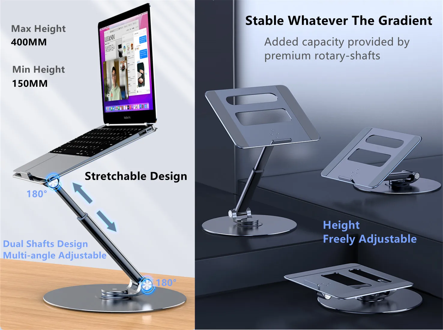 Растягивающаяся конструкция: эта подставка для ноутбука длиной руки растягивается, может поднять экран ноутбука от 150 мм до 400 мм, благодаря этому дизайну вы можете выбрать сидение или работу стоя, вы всегда можете найти высоту и угол, которые вам нравятся, независимо от того, сидеть или стоять.