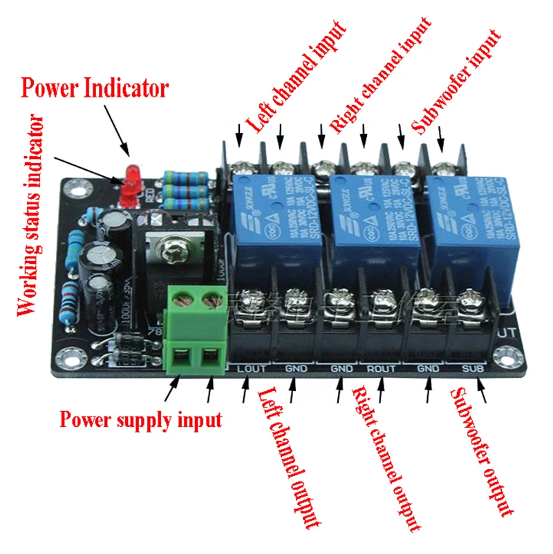 Схема платы проста, проводка проста и безопасна и надежна. Светодиодный индикатор работы загорается при защите и гаснет при нормальной работе. Использование OMRON Реле, подходит для большинства плат усилителя мощности.