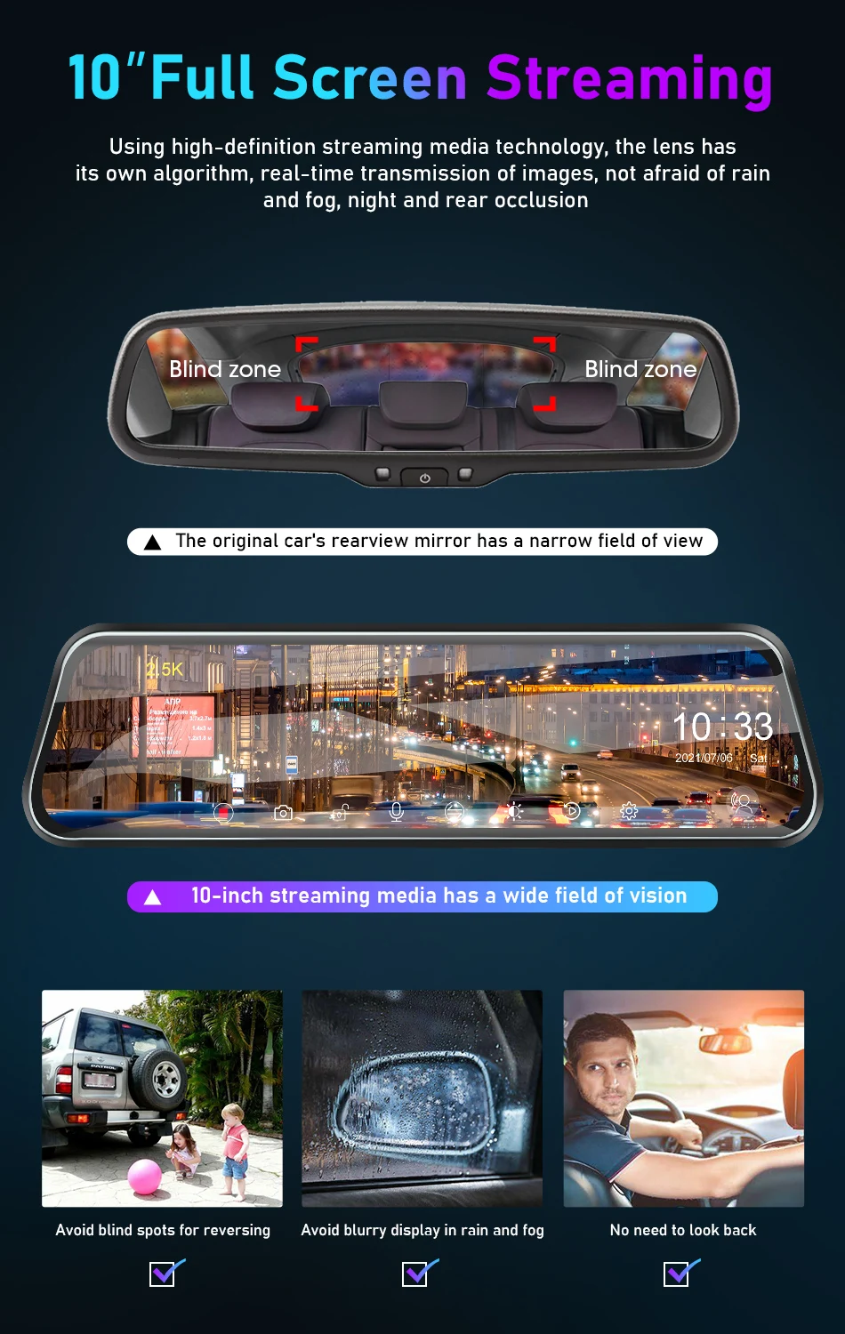 10 дюймов полный экран, широкое поле зрения, меньше слепых зон, удобнее и безопасного вождения.