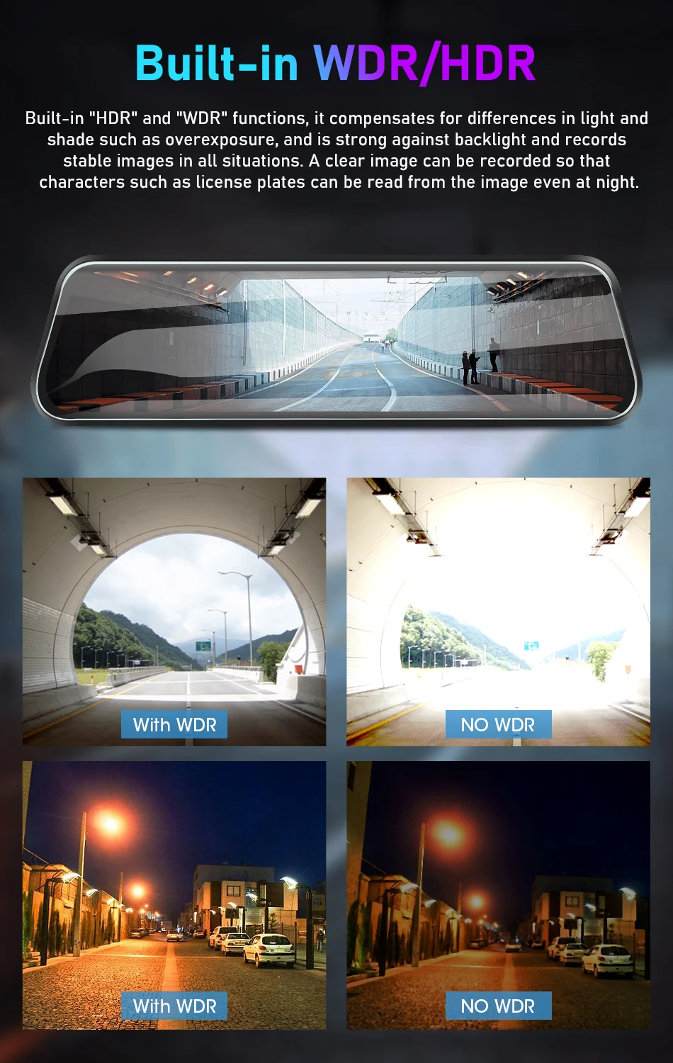 Встроенная функция "HDR" и "WDR", она компенсирует различия в освещении и тени, такие как Передержка, и сильна против подсветки и записывает стабильные изображения во всех ситуациях. Четкое изображение может быть записано так, чтобы такие знаки, как номерные знаки, можно считывать с изображения даже ночью.