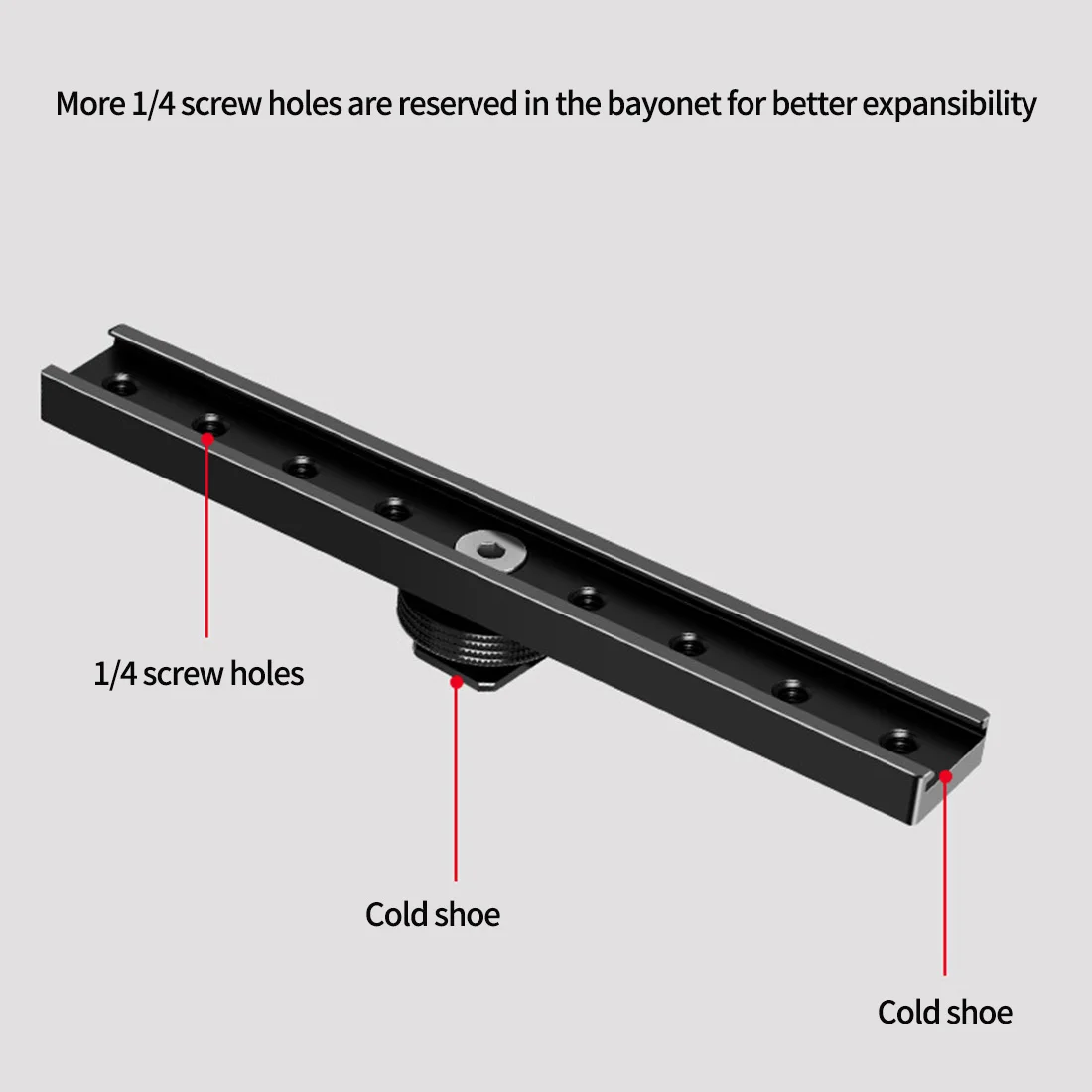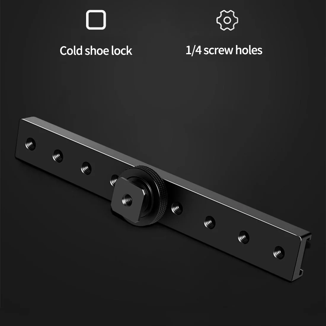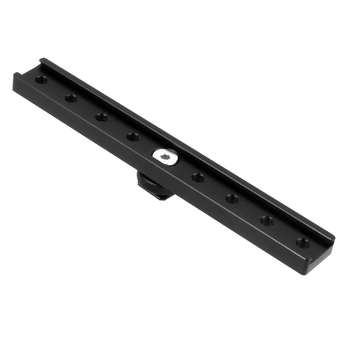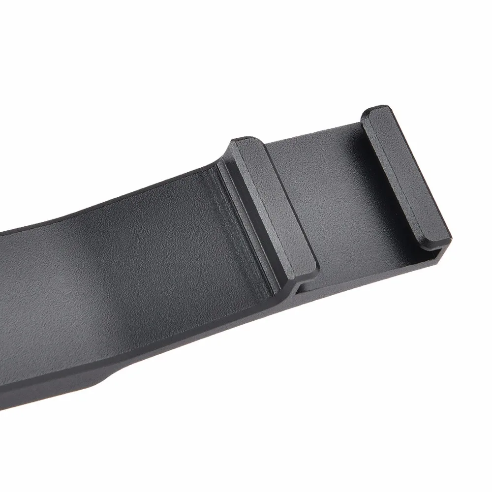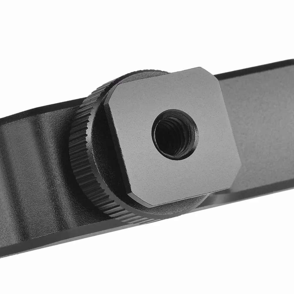 Очень длинная Пряжка для горячего башмака длиной 18 см, положение горячего башмака на рельсе может быть перемещено, а Пряжка снабжена несколькими резьбовыми отверстиями 1/4 для большего расширения.