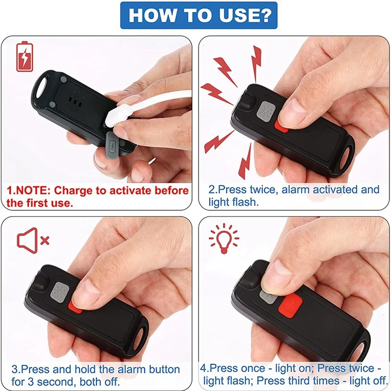 RECHARGEABLE & IP66 WATERPROOF - Our personal safety alarm don't need to replace the battery and it is rechargeable. Just directly charge it with cable, which is included in the package. NOTE: Before the first use, please charge the alarm to activate it. When it beeps 3 times and light flashes 3 time, it means it's time to charge it until the indicator light turns to green. And the continuous ear-piercing alarm can last 40 min.