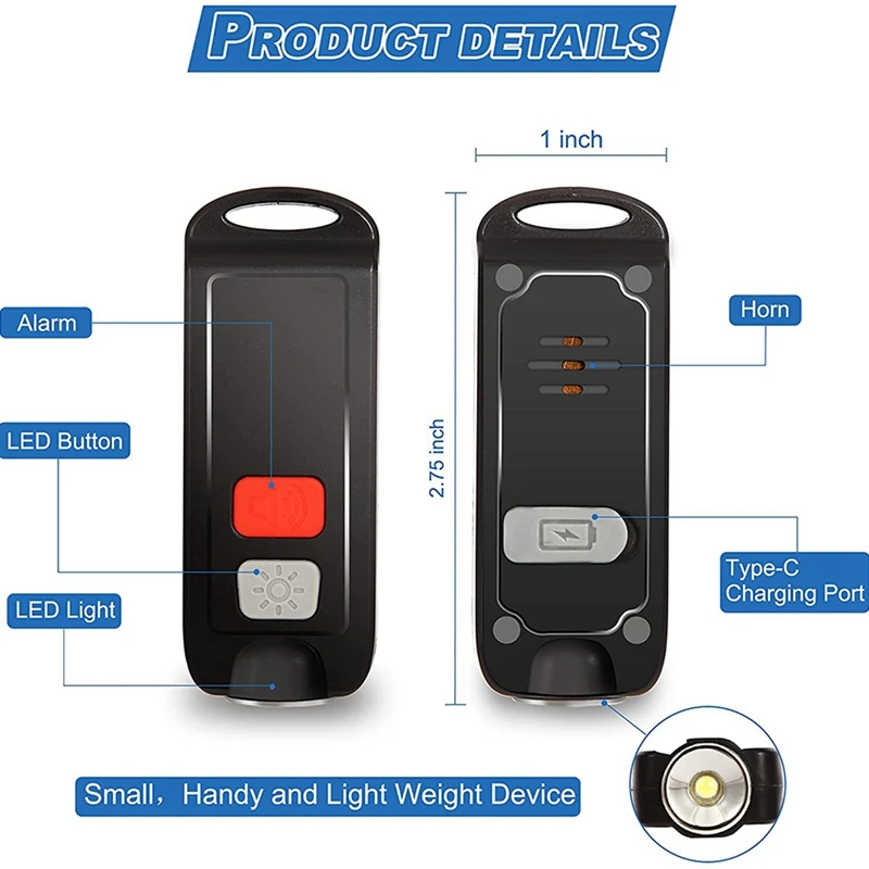 BRIGHT LED LIGHT with FLASHLIGHT - New version bright and high-intensity LED light, which is bigger and lighter than the personal alarm before. It also has flashing mode: press the light button once, the light on; Press again, the light flashes; Press the third time, the light off.