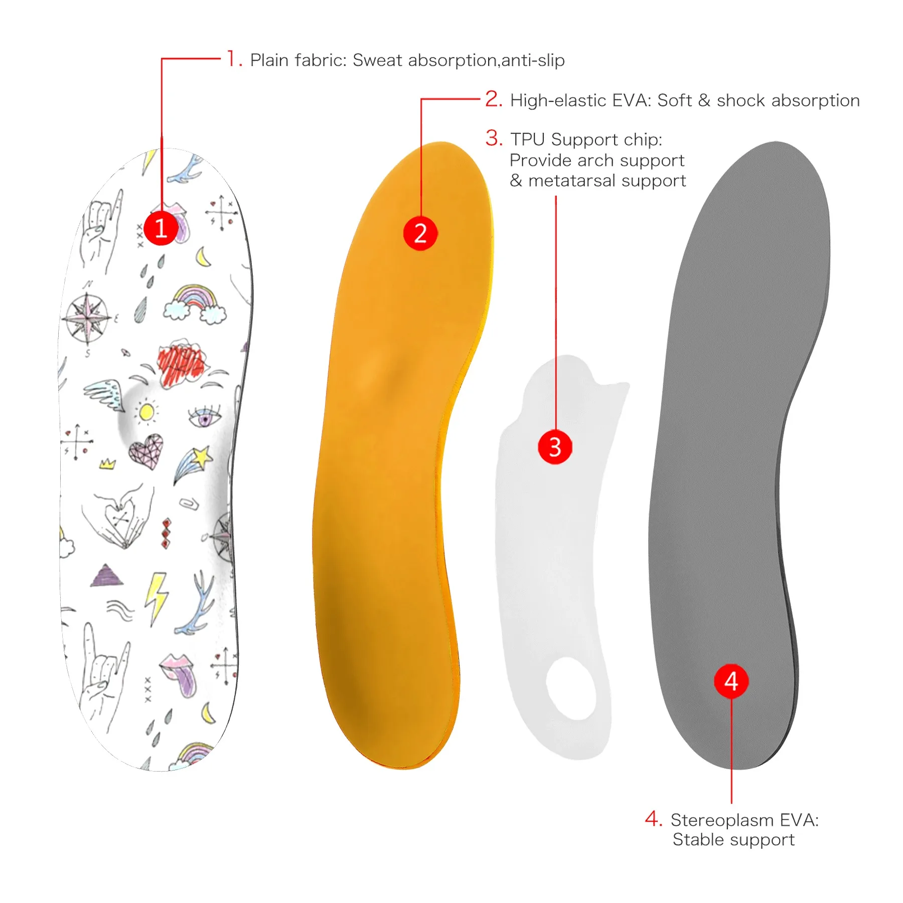 Материал EVA обладает отличной амортизацией и анальгетическими эффектами, а также помогает сохранять прохладные и противоскользящие эффекты. Полимер EVA обладает хорошей амортизацией и эластичностью, уменьшает воздействие и снимает боль в ногах.