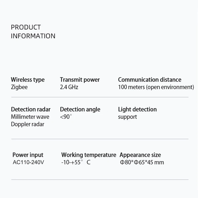 1-точное восприятие человеческого тела: Этот продукт решает болевые точки, которые традиционные человеческие датчики не могут обнаружить наличие статического человеческого тела. Используя передовую инфракрасную технологию, она может точно определить, есть ли люди в области, будь то активный или статический.