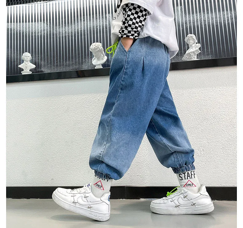 1 Мода 2021 г. Осенние джинсовые штаны для маленьких больших мальчиков, одежда