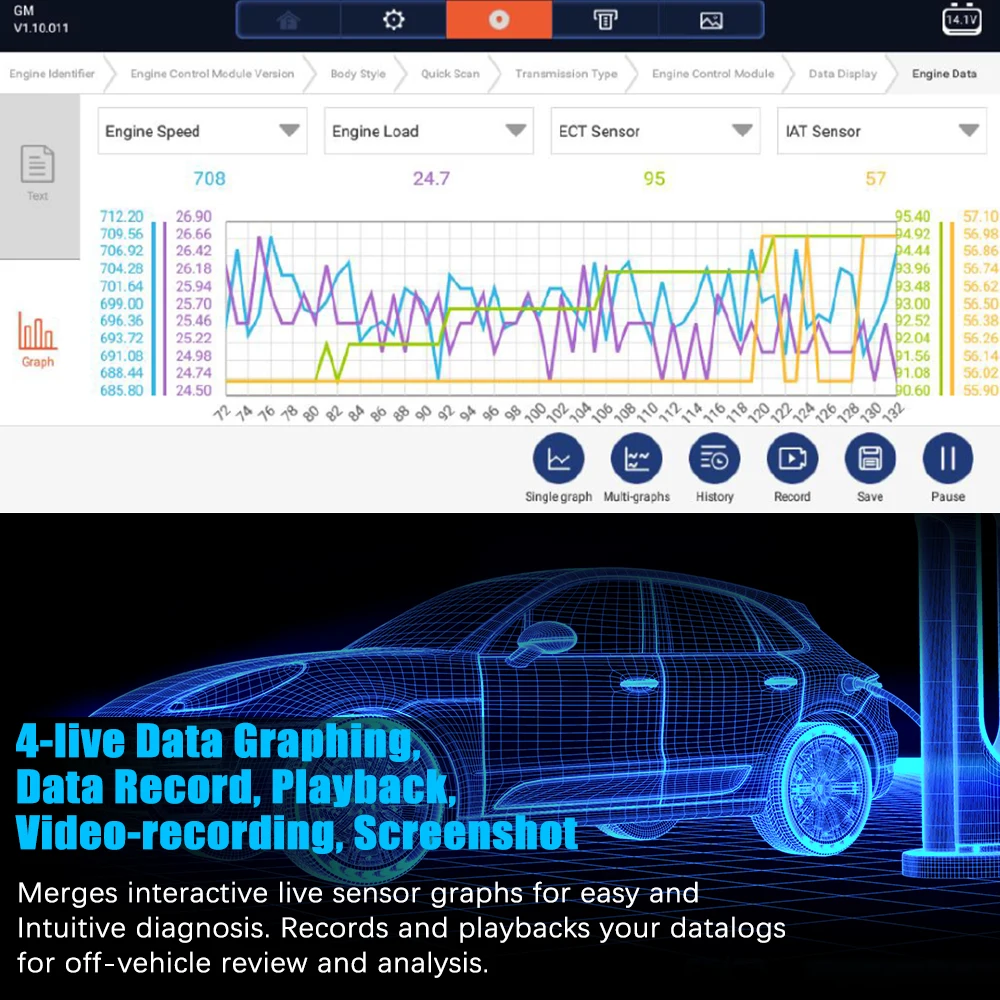 Все контролируемые модули сканирования и диагностики проблем, такие как система двигателя, система подушки безопасности, система ABS, система передачи, тормозная система, система сигнализации, система входа без ключа, система TPMS, система рулевого управления, система колес, топливная система, И т. Д. Это занимает всего несколько минут, чтобы закончить полное сканирование вашего транспортного средства и сделать быструю диагностику и техническое обслуживание с помощью кодов чтения/очистки, рамки замораживания просмотра и графических данных в реальном времени.