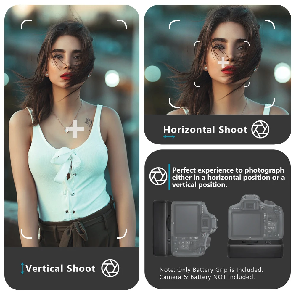 -Вмещает до 2 LP-E10 батарей или 6 батареек AA для обеспечения длительной мощности для длительных съемок.