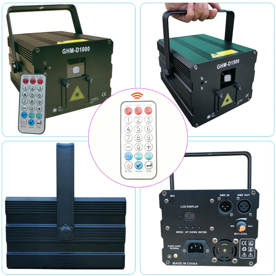 Лазерный источник (Варианты):Высококачественный лазер DPSS, 1 Вт: Красный: 638nm-300mw, Зеленый: 520nm-80mw, синий: 445nm-600mw/1,5 W: