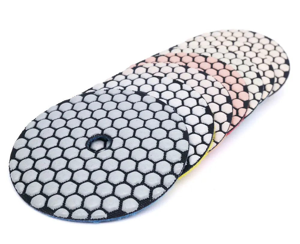 Высокое качество 4 дюйма сухой полировальник, агрессивные, гибкий и прочный на поверхностей, таких как бетон Гранит Мрамор кварцевые Стекло терраццо Травертин. Светильник из цветной смолы, не меняет цвет самого камня, с быстрым остеклением, хорошей яркостью и не выцветает.