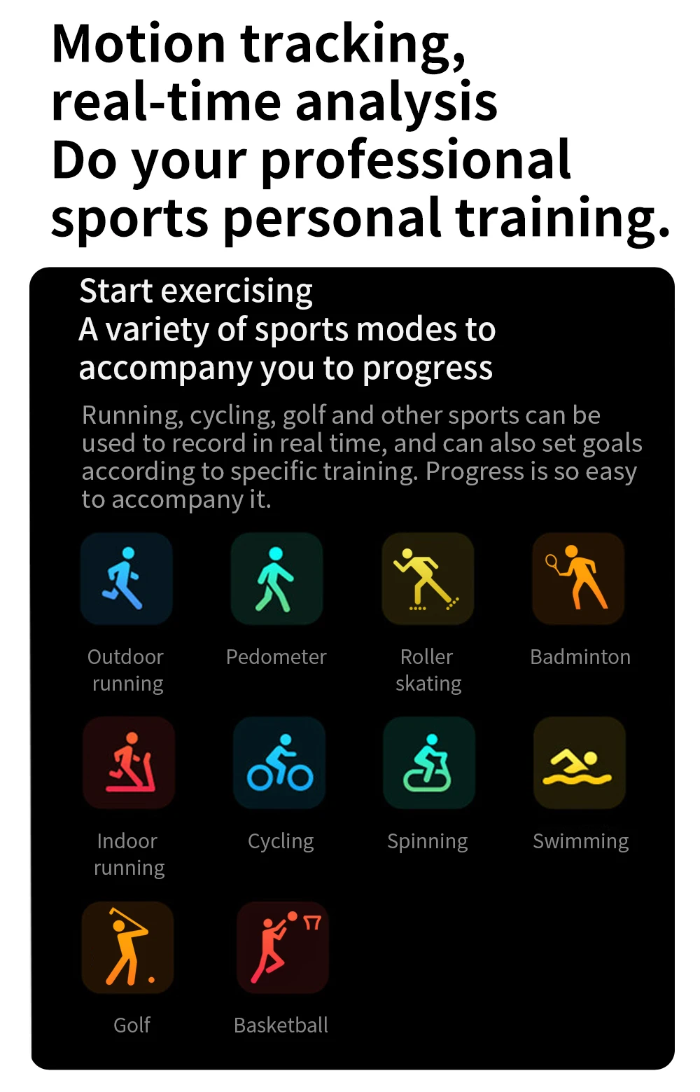 3. Мульти-спортивные режимы: подсчет шагов, бег, Велоспорт, Крытый бег, плавание, упражнения, спиннинг, танцы, Катание на роликах, баскетбол, бадминтон, гольф, регби, теннис