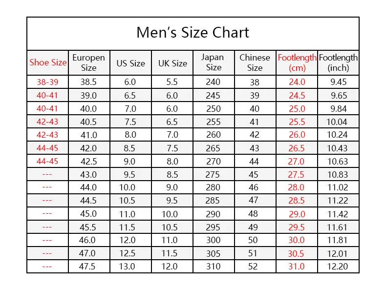Например, длина моей стопы 240 мм, я выберу размер 38-39, но если у меня широкая или Толстая стопа, Я добавлю 5 мм к длине своей стопы (245 мм) и выберу Размер 40-41.