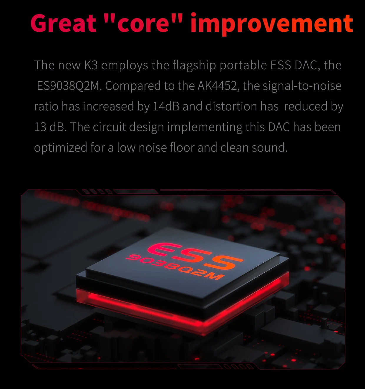Оснащен чипом декодирования USB Xmos, с использованием зрелого и стабильного чипа драйвера OPA926, чип DAC использует флагманскую модель ESS ES9038Q2M в области портативных приложений.