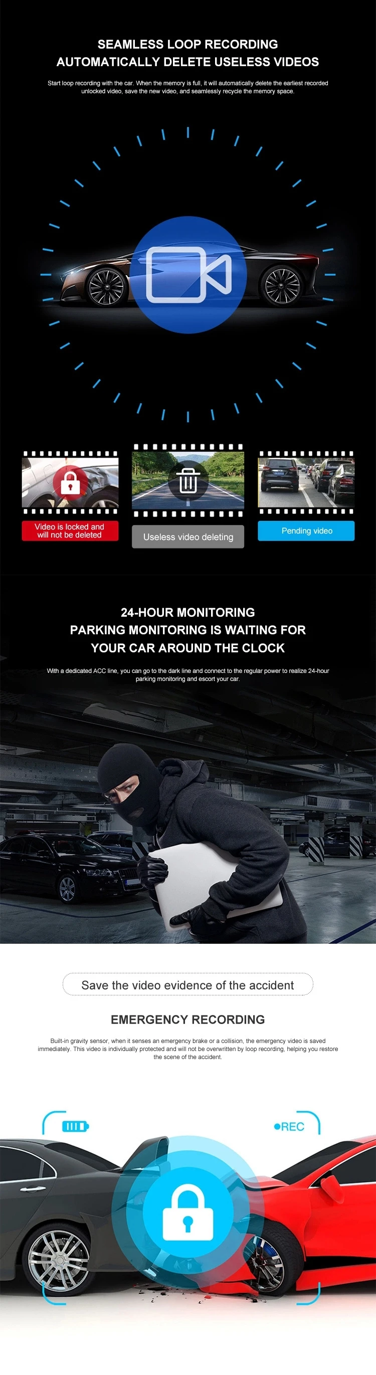 6. Новое видео с временным интервалом: мониторинг парковки 24 ч, каждый раз охраняет ваш автомобиль при входе в мониторинг парковки, принимается съемка с временным интервалом, например, один кадр в секунду, два кадра в секунду, И т. д., а также 1 минуте высокой четкости видео запись сохраняется каждые 30 минут, чтобы сэкономить пространство памяти