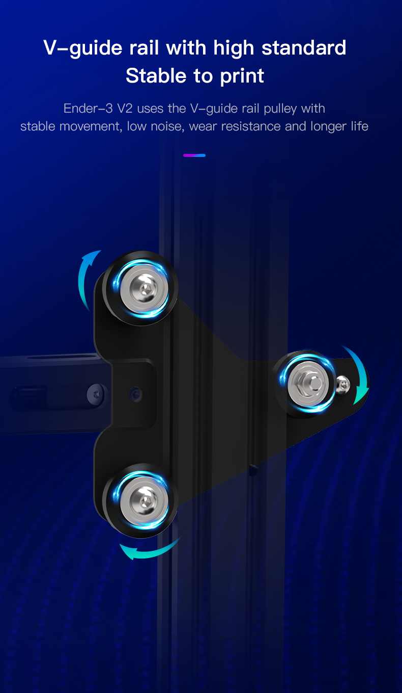 Ender-3 V2 использует v-направляющий рельсовый шкив с стабильным движением, низким уровнем шума, износостойкостью и длительным сроком службы.