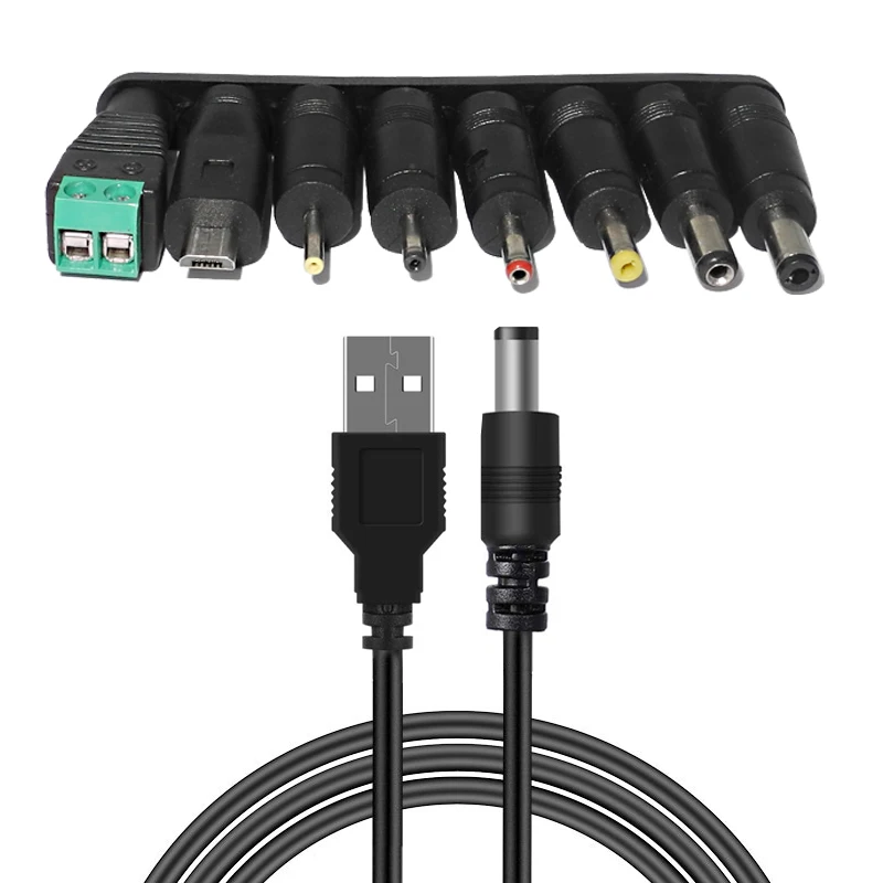 Универсальный кабель: Кабель питания от USB до DC с 8 взаимозаменяемыми разъемами, что делает его подходящим для большинства бытовых приборов. Вам не придется беспокоиться о поиске подходящих адаптеров при использовании различных устройств.