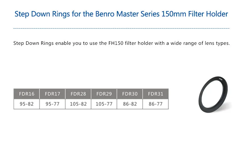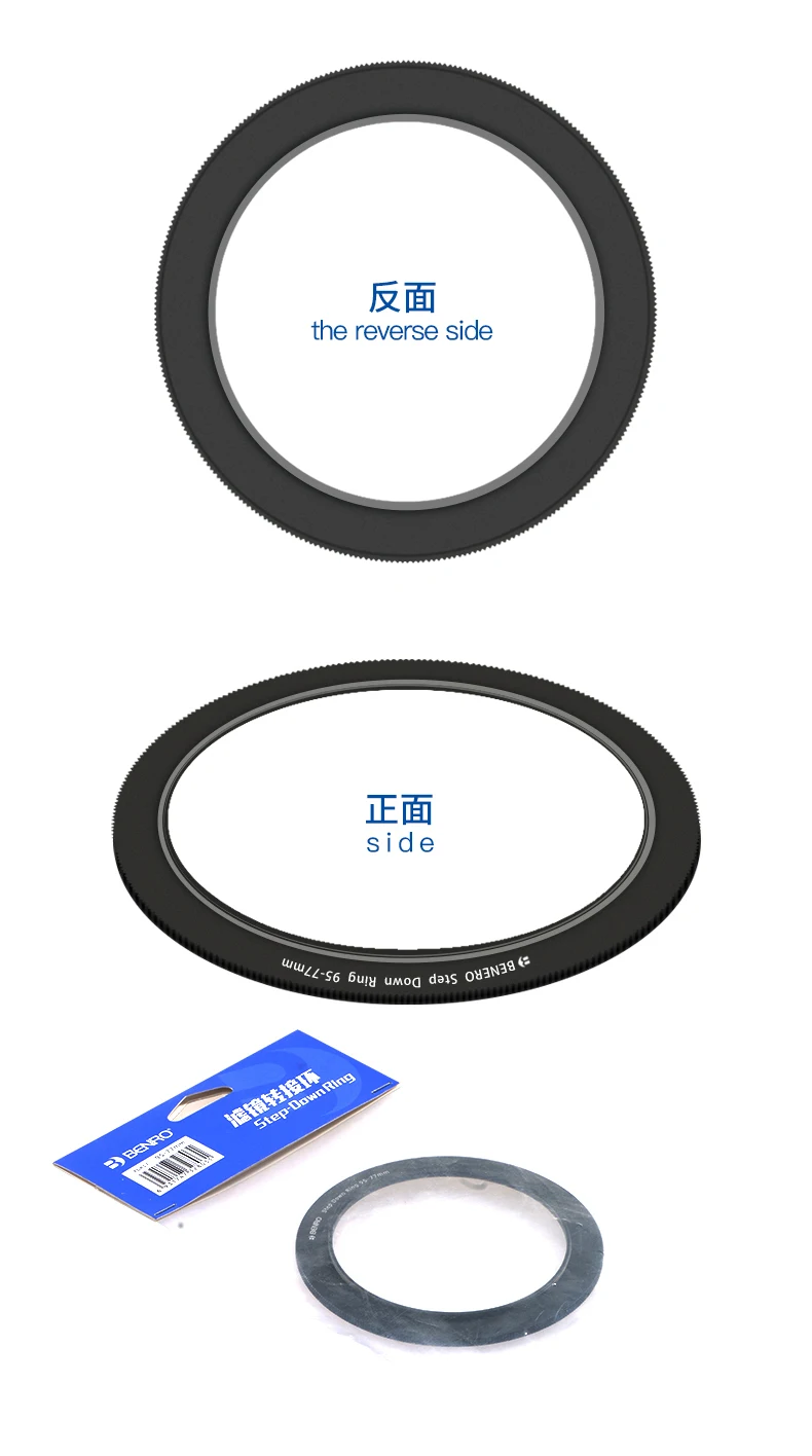 Название продукта: у пользователя с системой квадратных фильтров 150 часто есть линзы с другими креплениями, например 95 мм, 77 мм и т. д. Использование понижающего кольца может помочь пользователям использовать эту систему на других линзах.