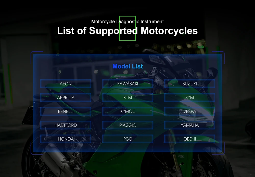 Hartford, Aeon, Honda, SYM,Yamaha,Suzuki,Kymco,Kawasaki,Piaggio,PGO,KTM и т. д. Поддержка нескольких языков: английский, китайский, тайский, индонезийский, вьетнамский, малайский.