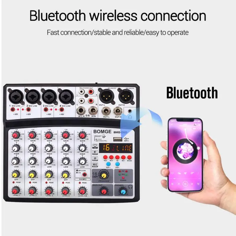Миксер оснащен входным усилением и высокой регулировкой басов. Встроенный блок питания in48VPhantom подходит для прямого источника питания конденсаторного микрофона. Выходной порт гарнитуры высокой четкости, MP3Player, прием Bluetooth, со звуковой картой подключения, and16Digital effects.