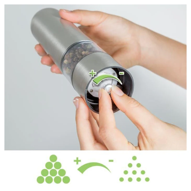 Эта красивая электрическая шлифовальная машина для соли и перца из нержавеющей стали, оснащенная керамической шлифовальной машиной, первого качества облегчает приправа ваших блюд.