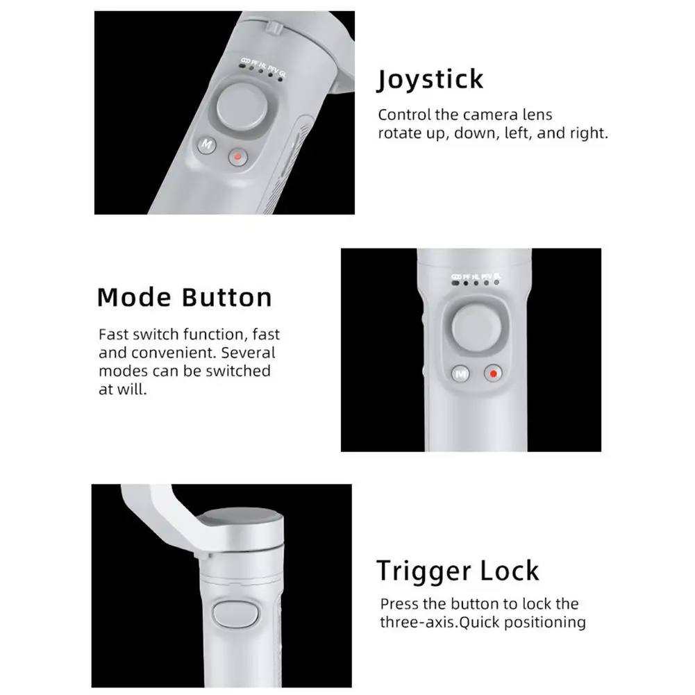 4. Простота в эксплуатации: Этот трехосевой ручной карданный шарнир HQ6 прост в эксплуатации и прост в эксплуатации. Можно управлять только несколькими кнопками или даже одной рукой. Просто нажмите кнопку питания этого смартфона панорамирования/наклона, и вы можете переключиться с портрета на пейзаж, не вынимая телефон или ослабляя винты. Вы также можете масштабировать и фокусировать, нажав на слайдер слева.