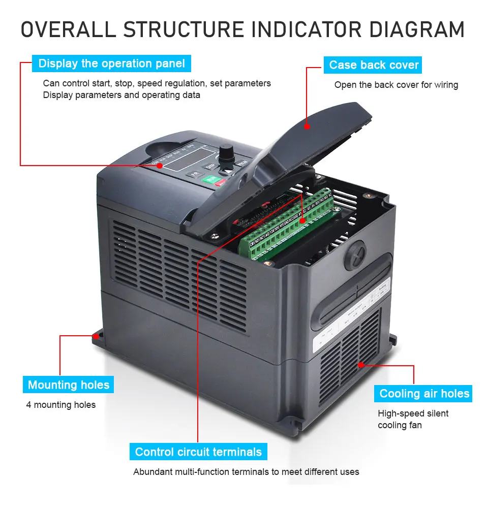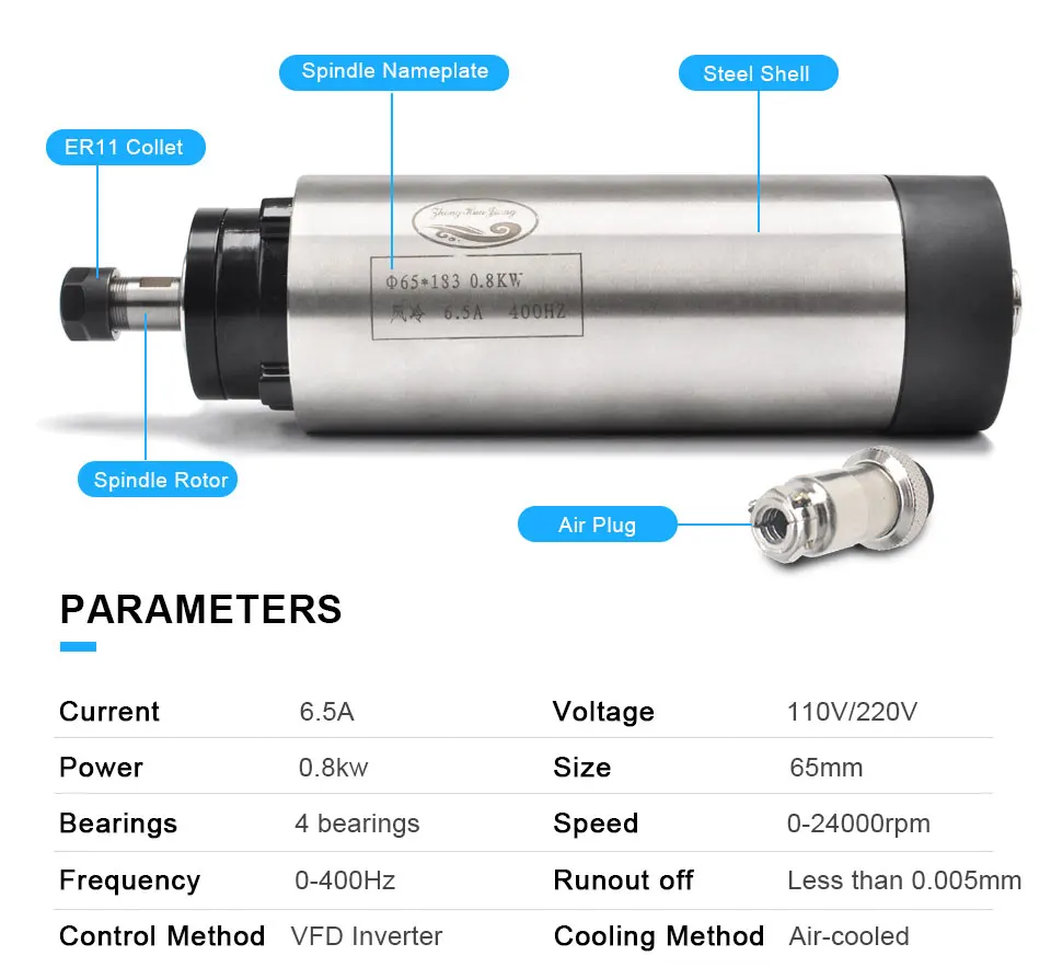 The air-cooled spindle uses a fan to dissipate heat. The spindle has high torque and strong cutting force. It has the advantages of fast speed, small size, light weight, low material consumption, low noise, low vibration, etc.