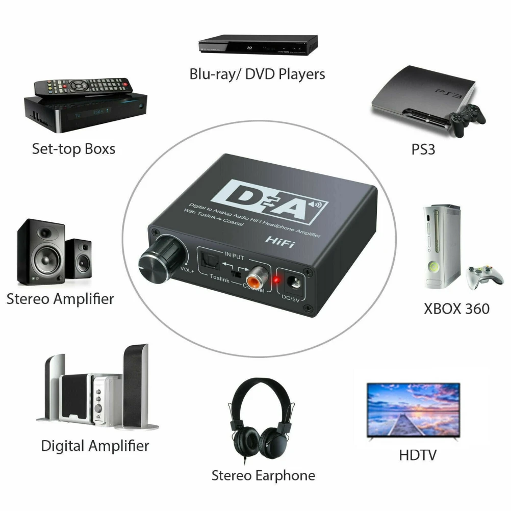 1. Цифро-аналоговый преобразователь: этот преобразователь DAC может преобразовывать коаксиальные или Toslink цифровые аудиосигналы в Аналоговый левый/правый аудио, и может быть подключен к внешним устройствам, таким как усилители, С помощью стандартного типа RCA, и вы можете также выбрать 3,5 мм разъем для наушников выход, подключенный к высокой четкости наушники, Идеальный выбор для домашнего или профессионального переключения звука.