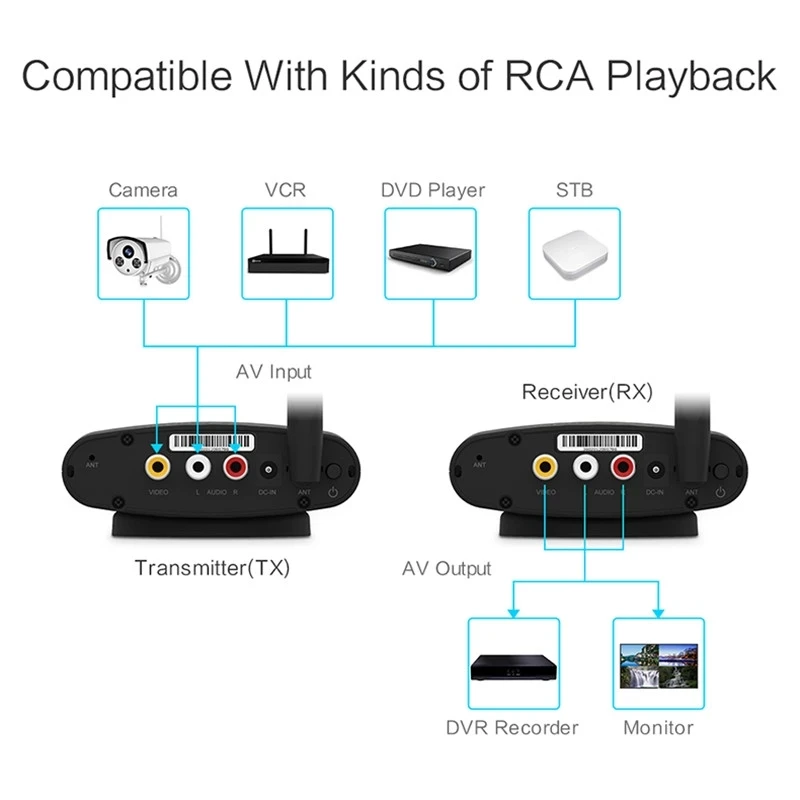 Он состоит из передатчика5,8 ГГцСхемы беспроводной передачи и преимущества дальней передачи, сильной защиты от помех и высокой подвижности. С помощью радиоволн, он может передавать сигнал от dvd-плеера, DVRCCTV камеры, IPTV, спутникового приемника, цифровая ТВ приставка или любые другие AV устройства на конце передатчика к телевизору в разных комнатах в конце приемника. Он может поддерживать пульт дистанционного управления R в конце приемника для реализации функции беспроводного управления устройствами из другого места. Так что вы можете наслаждаться свободным беспроводным HDAV обмен данными и Hi-Fi аудио и видео эффект