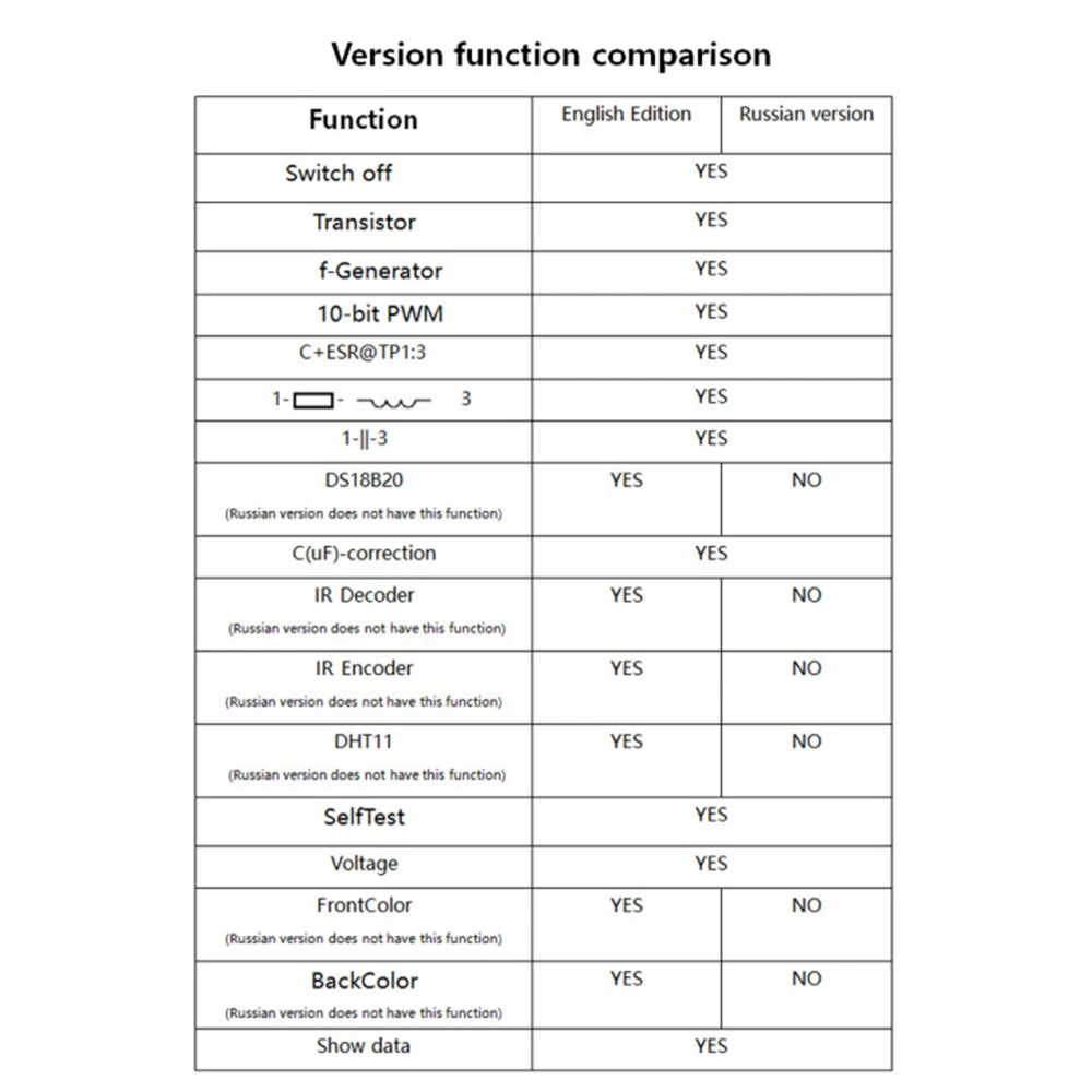 ①Control кнопка②Square wave и PWM outputinterface③ Интерфейс измерения напряжения④Original тест бит⑤In оригинальный основание теста160 полноцветный дисплей 160 × 128⑦Frequency измерительными интерфейс⑧Power разъем адаптераContact 9V контакт батареи 9V⑩Work индикаторСравнение функций версииОсобенности