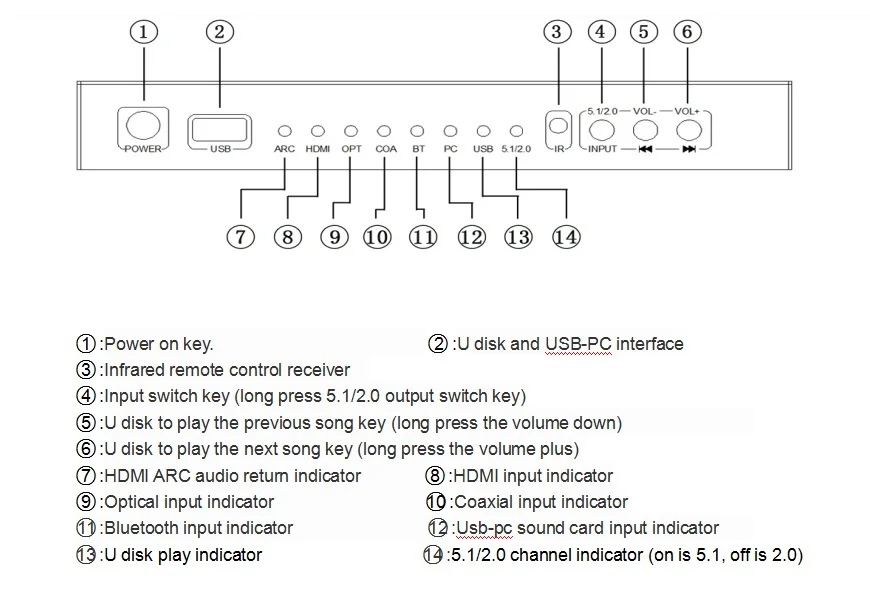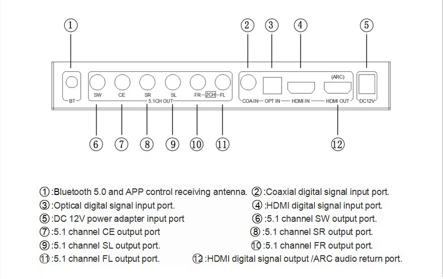1. Поддерживает один цифровой коаксиальный вход, один цифровой оптический волоконный вход, один HDMI вход, один ARC аудио вход возврата, один Bluetooth 5,0 вход, один способ воспроизведения USB вход и USB компьютер звуковой карты вход. Различные источники сигнала могут свободно переключаться.