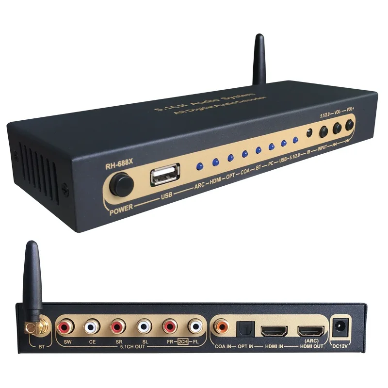 RH-688X система декодирования аудио может декодировать DTS Dolby AC-3, LPCM и другие исходные коды цифрового аудио формата; Поддержка воспроизведения дисков DTS, AC3, WAV, FLAC, APE, MP3 и другие без потерь Высокое качество воспроизведения аудио, поддержка HDMI входного исходного кода декодирования аудио, поддержка ARC аудио возврата, Поддержка декодирования оптического волокна и коаксиального ввода, поддержка беспроводной передачи Bluetooth 5,0, поддержка воспроизведения USB и компьютерной звуковой карты USB, поддержка функции мобильного OTG, воплотите в жизнь одну машину для завершения подключения и декодирования аудиооборудования. Может быть выход через 5,1 или 2,0 каналы,Полностью совместим сВсе усилители илиАктивное аудиоОборудование(Не поддерживает пассивную аудио-коробку)На рынке.Светодиодный дисплей передней панели отображает рабочий статус продукта, управление клавишами панели и управление инфракрасным пультом дистанционного управления. Его можно использовать с dvd-плеером, Blu ray плеером, сетевым плеером, телеприставкой, PS2, PS3, Xbox 360, ПК, домашним кинотеатром, автомобилем и многими другими развлекательными устройствами.