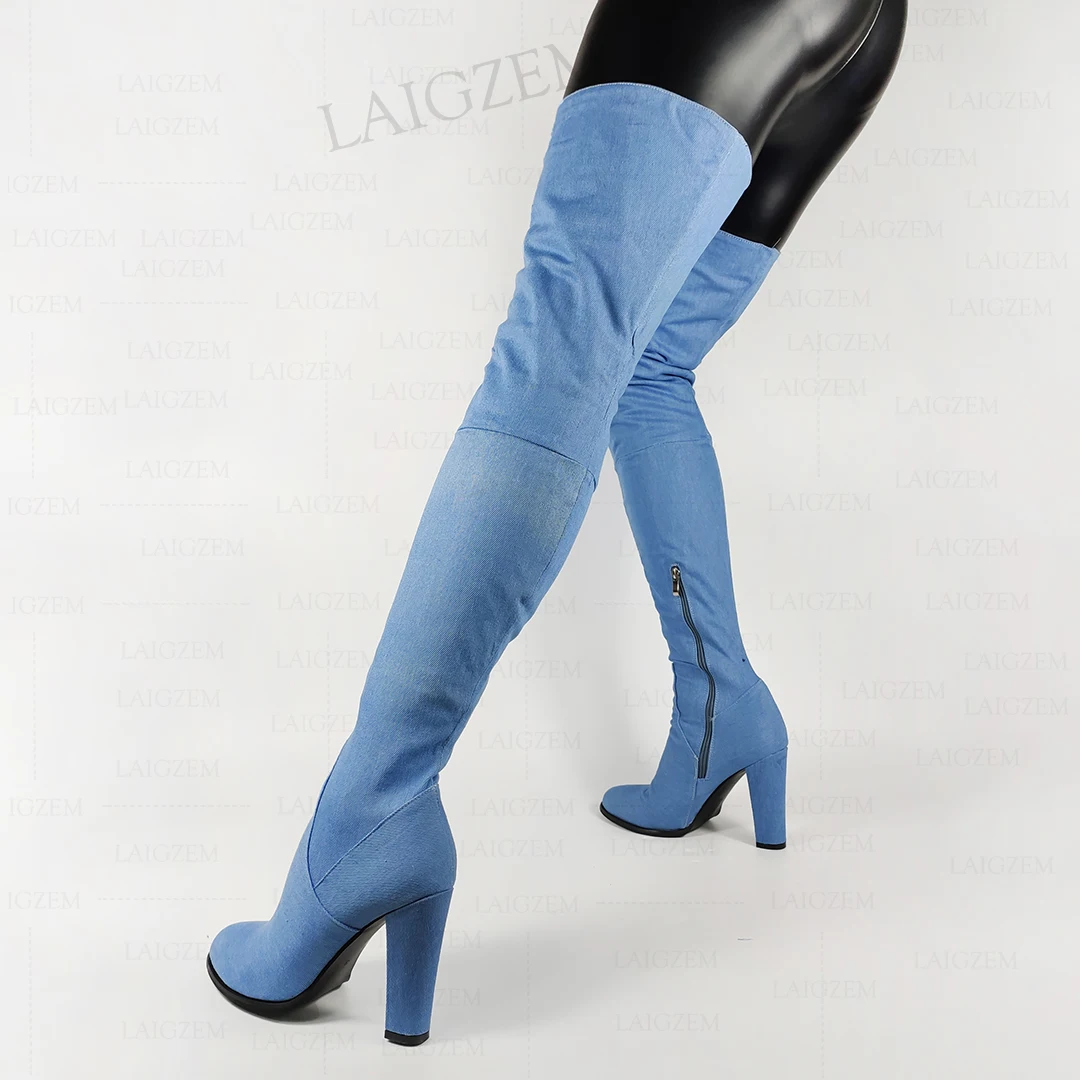 LAIGZEM/женские облегающие высокие сапоги; Джинсовые ботфорты с круглым носком на блочном каблуке; Botas Mujer; Женская обувь с застежкой-молнией сбоку; Большие размеры 41, 44, 47, 52